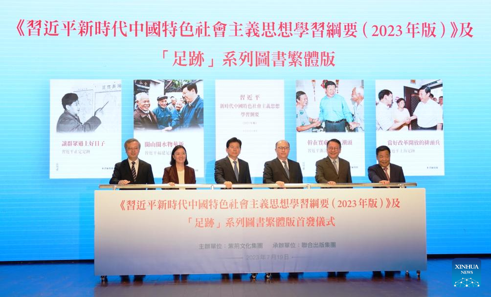 This photo taken on July 19, 2023 shows the launching ceremony of five books in traditional Chinese characters -- an outline for the study of Xi Jinping Thought on Socialism with Chinese Characteristics for a New Era and four books on President Xi's local work experience -- at the Hong Kong Book Fair in south China's Hong Kong. (Xinhua/Wang Shen)