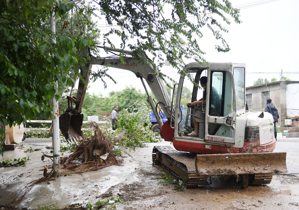 8月1日,在北京市房山區青龍湖鎮上萬村,工作人員清理倒伏樹木。新華社記者 張晨霖 攝