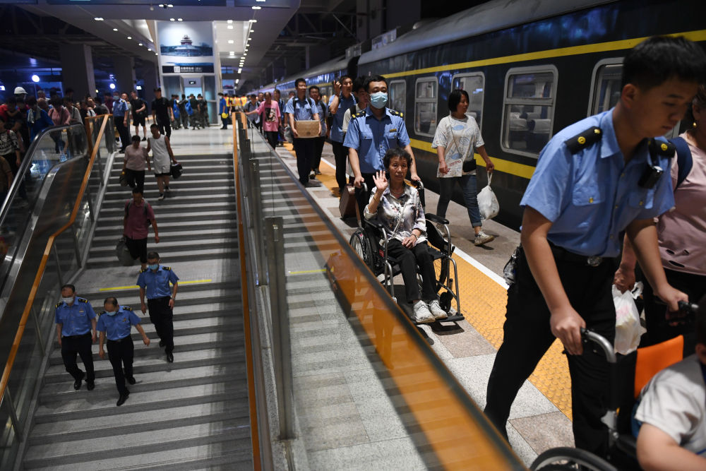 8月3日,K396次、Z180次列車的滯留旅客到達北京豐臺站。新華社記者 張晨霖 攝