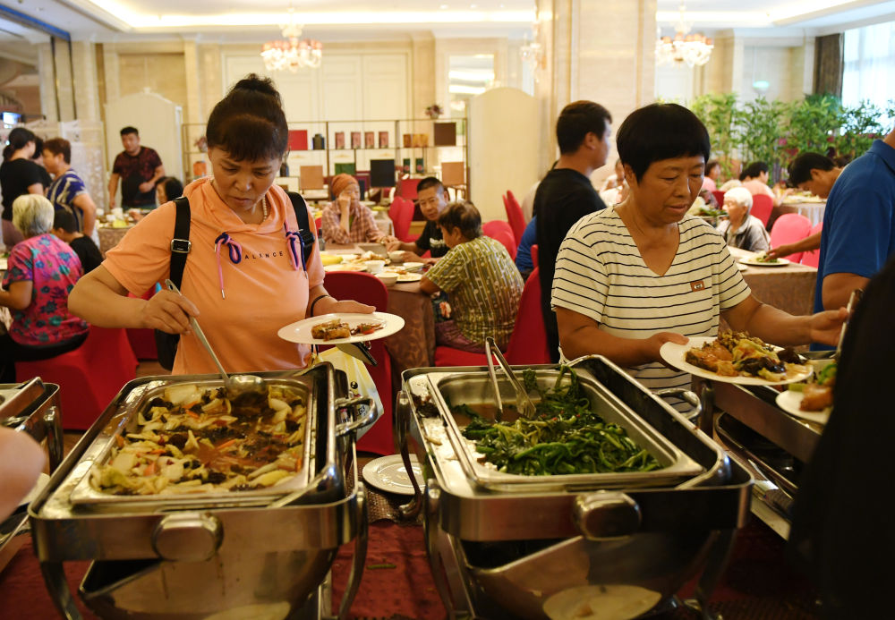 8月1日,北京市房山區青龍湖鎮的村民在臨時安置點用餐。新華社記者 張晨霖 攝