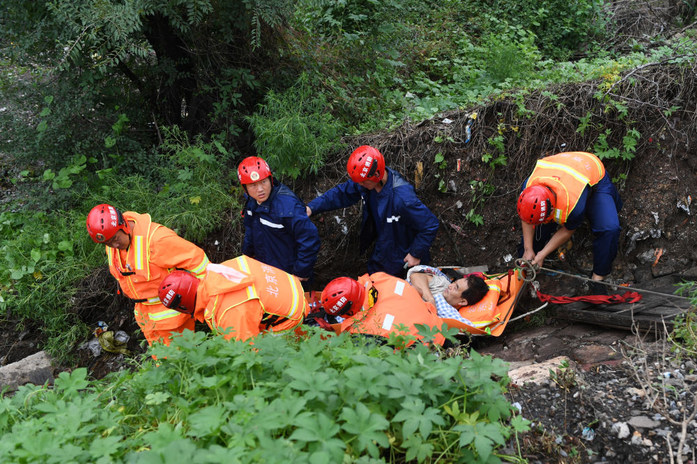 8月1日,在北京市門頭溝區水峪嘴村,北京門頭溝區消防救援支隊的消防員在轉運一名受傷村民。新華社記者 鞠煥宗 攝